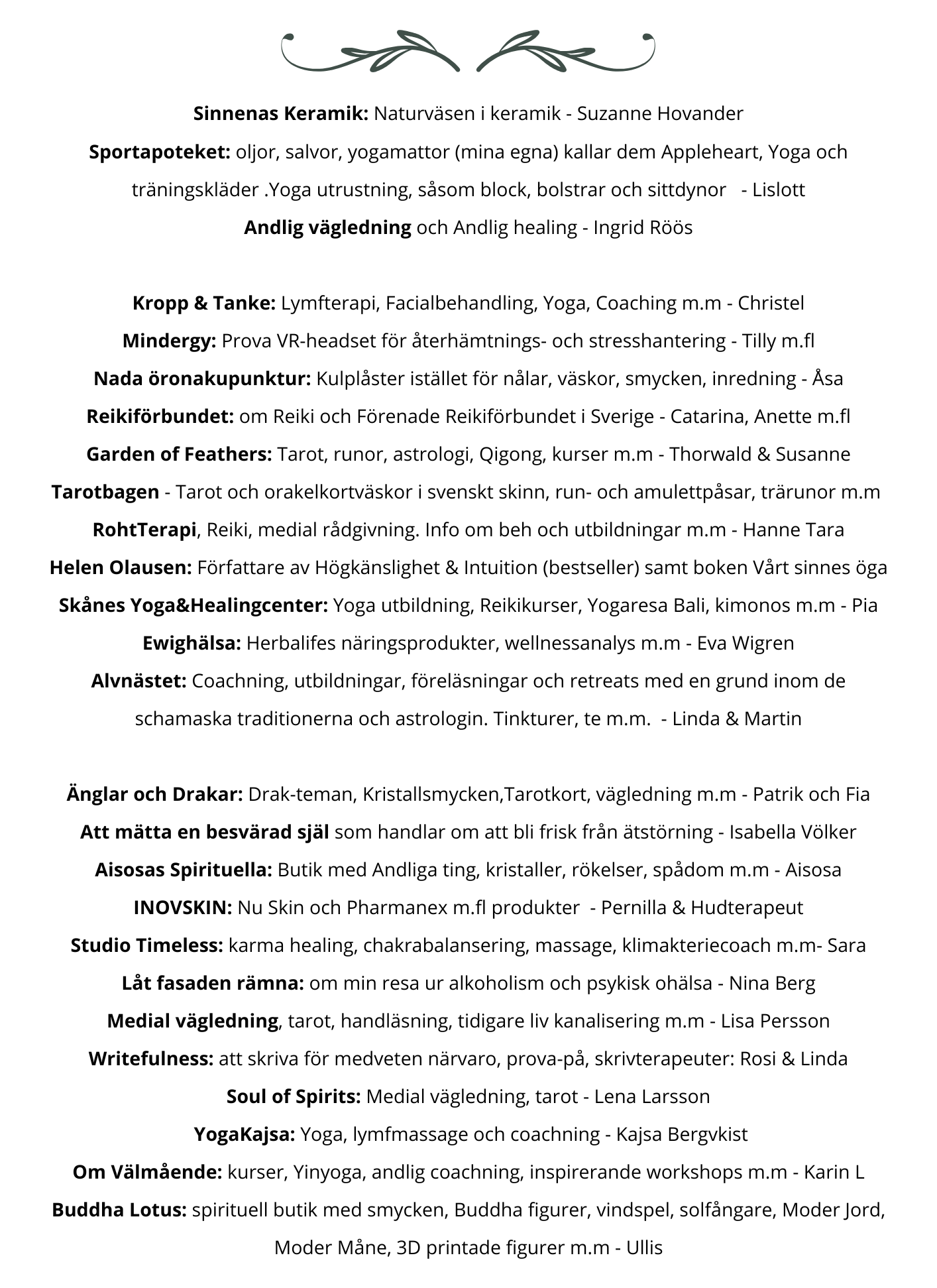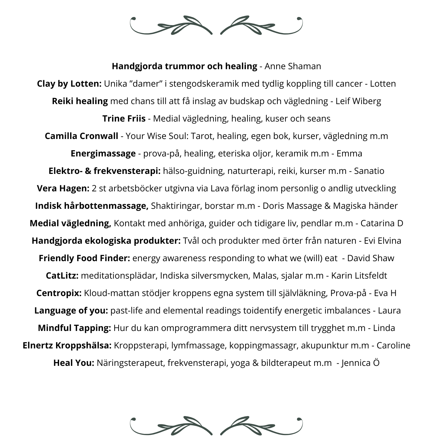 KOM OCH UPPLEV drygt 70 handplockade utställare inom holistisk hälsa, personlig utveckling och spirituellt/andligt, som bland annat erbjuder prova-på behandlingar, smakprov, ny varor och tjänster inom naturlig hudvård, läkning, friskvård, kost, skönhet, hantverk, smycken och mycket annat.